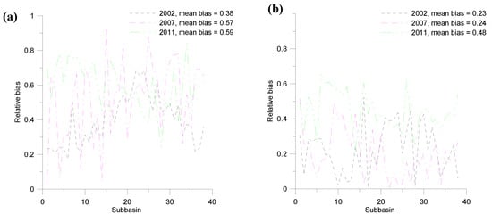 Comparison of the relative bias for the events of 2002, 2007 and 2011 for (a) before bias correction and (b) after bias correction.