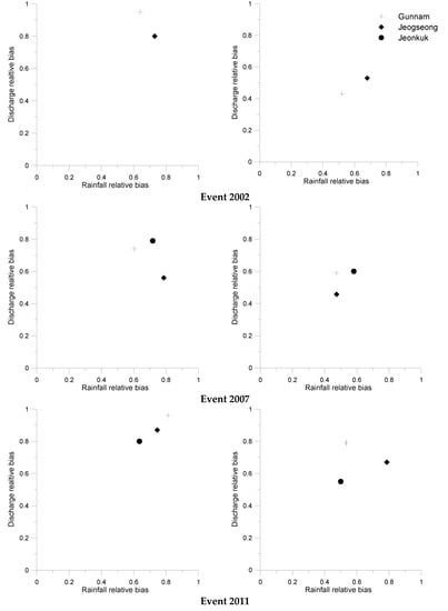 In this study, the streamflow is forecast using the precipitation forecasts in the SURR model. The real-time forecasts of both precipitation and discharge over the Imjin River basin were evaluated and the verification was performed for the Gunnam, Jeogseong and Jeonkuk hydrological stations. The bias assessments of the precipitation and discharge are shown in Figure 7 for the Gunnam, Jeonkuk and Jeogseong stations before and after post-processing. This figure shows a comparison between precipitation and flood forecast errors based on relative bias error, and present the relationship between flood error and the precipitation forecast error. The post-processing methods, including the TLS and DW methods, were proven to substantially reduce the biases of real-time forecast precipitation when compared to observed data sets. Furthermore, the findings indicate that the error in the real-time discharge evaluation is higher than the error in the precipitation, which is obvious for all three hydrological stations.