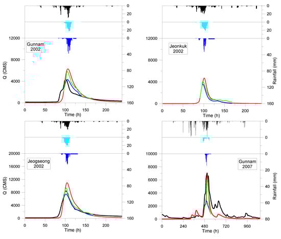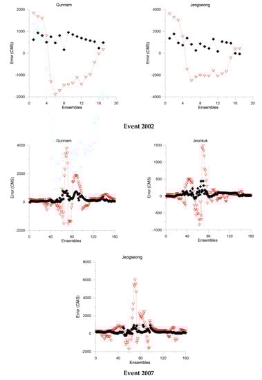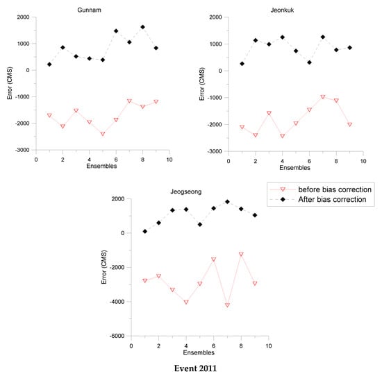 The performance of the flood forecast is evaluated and compared using the observed streamflow, in order to show how biases in forecast precipitation lead to inadequate streamflow forecasting. The error propagation in the Gunnam, Jeonkuk and Jeogseong stations are shown in Figure 8.