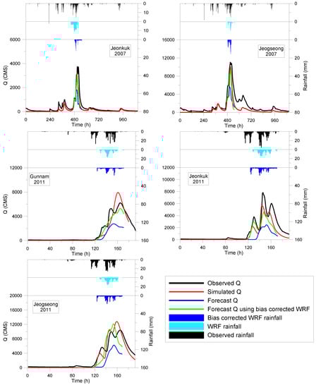 Applying the TLS and DW methods improved the accuracy of the results for MAPs and floods in the Gunnam, Jeonkuk and Jeogseong stations for the events in 2002, 2007 and 2011. After applying the bias correction methods, the real-time forecast data improved by reducing the biases in the raw WRF data and improving the estimation of the raw WRF data in all stations and events.