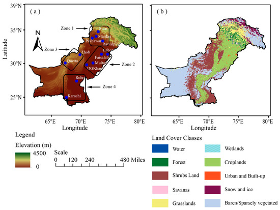 Map of the study domain showing (a) Elevation and locations of the selected regions and (b) land cover. The elevation map is based on Shuttle Radar Topography Mission (STRM) data [44]; whereas, the land cover map is based on the Terra and Aqua combined MODIS Land Cover Type (MCD12Q1) Version 6 data product available on [45]. The four zones in Figure 1(a) correspond to the selected regions with similar topography and climatology.