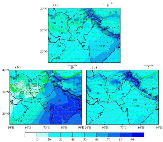 Synoptic meteorological conditions derived from the ECMWF, ERA-Interim reanalysis data sets at 850 hPa pressure level during 2003–2017, over and around the study domain; (a) Annual, (b) Summer, (c) Winter. The shaded color contour represents RH (%), and the green line contour represents air temperature (K), winds are represented by arrows pointing towards the wind direction and the length of arrows represent the wind speed (in ms−1).