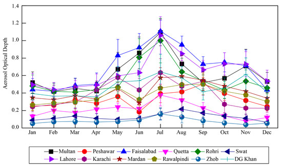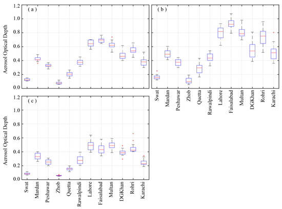 High AOD is observed over the stations located in the inland plains (Zone 2) especially during summer months similar to the results reported by a number of authors including Alam et al. [61] and Mehta et al. [98]. The AOD values generally experience a gradient as we move away from Zone 2 (Figure 1) in either direction with peak values observed over the regions located in this zone. The regions at higher altitudes (Figure 1, Table 1) (e.g., Swat, Zhob and Quetta) experience lower AOD values. Further, low AOD is generally observed during winter months but comparatively high over regions located in the central plains (Figure 3, Zone 2).