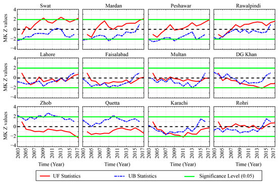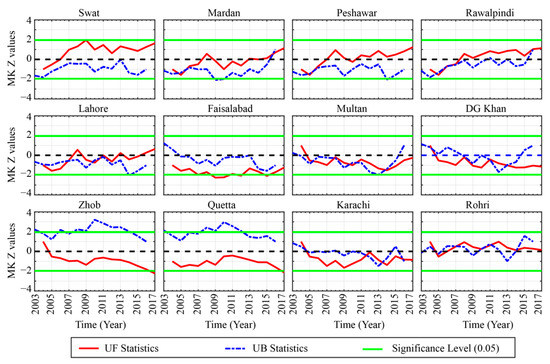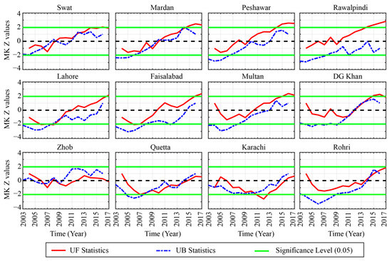 The transition of the climate from one stable state to another when some external forces compel the system to cross a certain threshold level is termed as an abrupt shift in the climate system. The SqMK test was used to detect the abrupt changes in temporal trends of seasonal and annual AOD time series [92,97]. This test also shows fluctuation in the trend over time. The SqMK test was used to detect abrupt changes in AOD trend on annual and seasonal bases over the selected locations. The statistics UF represent the trend variability in forward direction whereas UB represent the trend in the backward direction with zero mean and unit standard deviation. The sequential behavior fluctuates around the zero level. If they intersect each other and diverge beyond a specific threshold value (e.g., ±1.96 for 95% confidence level in our case), then there is a statistically significant change point. The point where they cross each other indicates the possible turning year of the trend within a time series [92,93].