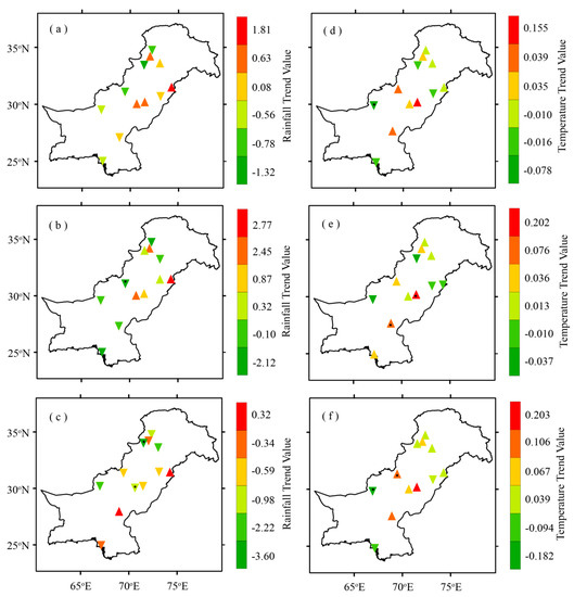Summer and winter are the two principle rainy seasons in Pakistan and precipitation in these seasons accounts for more than ~90% of the annual precipitation budget over the country [97]. The summer season is characterized by hot weather conditions when the daytime maximum temperature reaches around 40 °C (or even higher) in the central and southern parts of the study area. Cold weather prevails over the northern highlands during winter season whereas the central to southern plains mostly remain warm. Figure 9 shows the results of the m-MK test, whereas Table 4 summarizes the annual and seasonal trends in rainfall and temperature over the selected locations during 2003 to 2017 for each region.
