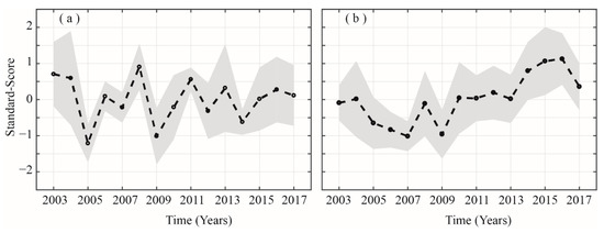 Standardized AOD time series during (a) summer and (b) winter over the study area. The black line shows mean standard values whereas the shaded region represents the standard deviations.