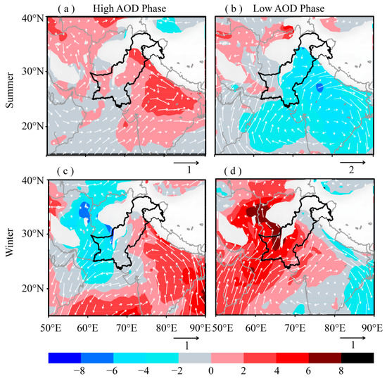 The winter season is mostly characterized by westerly and northwesterly weather pattern (Figure 2c). This weather system causes wide-spread rains over different parts of the study area with maximum intensity over western and northern highlands [97]. The RH and WS anomalies during winter season’s high AOD years are presented in Figure 11c. These anomalies show an increase in RH on the eastern side (Indian landmass) accompanied by a decrease in RH over the regions on the western side of the study area. The anomalous wind field shows a dominant easterly current, supporting the transport of aerosols from across the Indian border to eastern and northeastern Pakistan. Comparatively low RH and reduced WS fields prevail over the regions on the western side indicating a dry winter season with reduced rainfall due to westerly synoptic weather systems. Reduction in rainfall may cause an increase in AOD due to less likelihood of aerosol washout due to rain. Thus, the presence of these anomalous conditions might be the possible causes of enhanced AODs over the study area. The anomalous atmospheric conditions during the winter season low AOD phase are almost opposite to those during the high AOD phase (Figure 11d). High (low) RH over the regions on western (eastern) sides along with dominant westerly wind fields, representative of a typical western weather system, prevails over the study area. The higher RH over the regions on western side is suggesting a wetter than normal winter season due to a typical western weather system. The rainfall washout of atmospheric aerosols may be the cause of reduced AOD over the study area. It is interesting to note that the atmospheric fields have shown a dipole pattern over the regions on eastern and western sides of the study area during high/low AOD phases. However, investigating the dynamics and mechanism of this dipole pattern is beyond the scope of the present study.