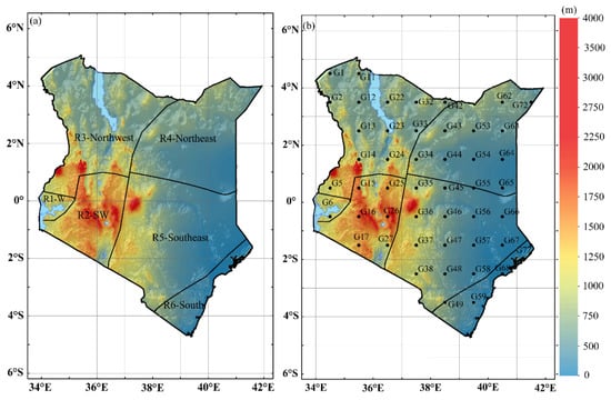 Elevation of the study area with distinct homogeneous locations, as delineated by Indeje et al. [] and the respective grid cells in each region.