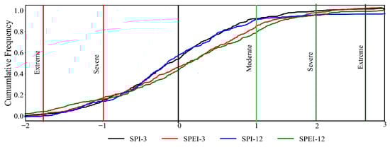 The empirical cumulative frequency of the monthly Standardized Precipitation Index (SPI) and the Standardized Precipitation–Evapotranspiration Index (SPEI) for the Kenya region. Vertical lines represent the dry spell (red) and wet spell (green) thresholds, classified in drought indices presented by Gozzo et al. [].