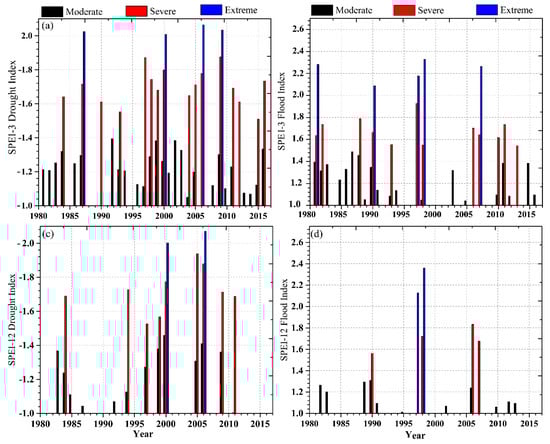 This study thus highlights key features of drought and wet events, which remain the major climatic extremes that affect people and property [,]. Understanding the historical complexities and dynamics of drought and flood events could build the momentum to conduct further studies on the future evolution of these extreme events over the study area, with a view of recommending appropriate and timely policies to avert damages and loss of life. This study reveals the occurrences of mild extreme dry events, whilst moderately severe dry events dominated most parts of the domain (Figure 6 and Figure 7). The high intensity and frequency of drought were noted in SPEI-3, whereas the least occurrences of extreme events were recorded in SPEI-12.