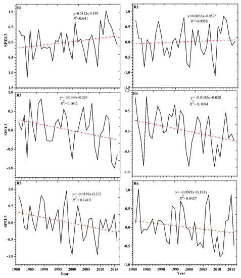 Linear trends of dry and wet events for SPEI-3 over six distinct climatic zones, as presented in Figure 1.