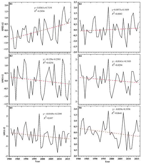 Linear trends of dry and wet events for SPEI-12 over six distinct climatic zones, as presented in Figure 1.