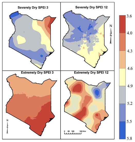 Furthermore, the duration of the dryness/wetness situation is presented by the length of time (months) that the drought index is consecutively above or below a truncation value. The intensity, severity, and frequency of extreme events define drought/wet episodes. The dominance of the dry/wet cases was examined for each grid cell and timescale, and it was computed on the percentage of the frequency of each incidence with reference to the total number of months. This approach was successfully employed in a recent study of drought evaluation along the major water basin in Kenya []. The intention of employing this approach was to categorize regions that frequently experience the concurrence of extreme and severe climatic cases at corresponding periods.