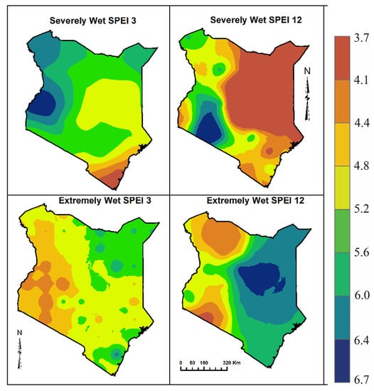 Frequency of severe (top) and extreme (bottom) wet events computed for the SPEI-3 and SPEI-12 month respectively over Kenya, 1981–2016.