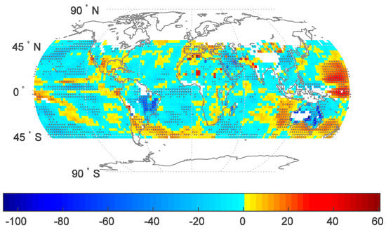 Tendencies of model-computed downward surface solar radiation anomalies (changes in surface solar radiation (SSR), in W m−2) during the period 2001–2009. Dots indicate geographical cells for which the SSR tendencies are statistically significant.