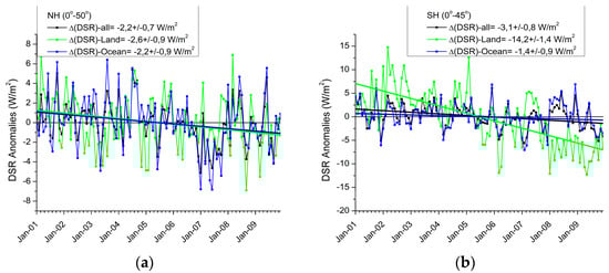 Overall assessments of GDB on a hemispherical scale are useful since they can be related to global scale climate changes. Therefore, the anomalies of the hemispherical averages of SSR fluxes were computed, and their time series along with the corresponding time series of land and ocean areas of each hemisphere for the period 2001–2009 are overplotted in Figure 2a,b for the Northern and Southern Hemispheres, respectively. The same information is given in Figure 3 of the study by [20] but for the period 2001–2006. Apart from the different temporal coverage, another difference is that, in the present study, the hemispherical averages refer to world areas up to 50° N and 45° S, whereas in [20] they would refer to areas reaching 70° N and 60° S. Although dimming is predominant in both the present study and the previous one, there are two major differences. The first difference concerns the Northern Hemisphere (NH), over which SSR has undergone a similar decrease over both land and oceans from 2001 to 2009, equal to −2.6 W m−2 (or −0.29 W m−2/year) and −2.2 W m−2 (or −0.24 W m−2/year) respectively, yielding an overall dimming of −2.2 W m−2 (or −0.24 W m−2/year). On the contrary, in [20], in the NH, SSR was found to have undergone a slight increase (brightening) of 0.17 W m−2 (or 0.028 W m−2/year) arising from a brightening of 0.44 W m−2 (or 0.07 W m−2/year) over land and a dimming of −0.75 W m−2 (or −0.125 W m−2/year) over ocean areas of NH. This difference may be attributed either to the different time periods or the different geographical coverage. In order to examine this, the tendencies of SSR in the present study were recomputed but for the period in [20], i.e., for 2001–2006. The results (Figure S2) yielded a dimming in both land and ocean areas of NH, equal to −2.2 W m−2 (or −0.37 W m−2/year) and −0.99 W m−2 (or −0.165 W m−2/year) respectively, resulting in an overall dimming of −1.1 W m−2 (or −0.183 W m−2/year). The strong similarity of these results (2001–2006) with those of Figure 2a of the present study (2001–2009), and the remaining differences with the results of Figure 3a of [20] for the same period, lead to the conclusion that the different geographical coverage is the most important reason for the difference between the Figure 2a of the present study and Figure 3a of [20]. The same analysis for SH (South Hemisphere), revealed that the time series of SSR anomalies of Figure 2 but for the period 2001–2006, yields a dimming of −8.5 W m−2 (or −1.42 W m−2/year) over land, a dimming of −1.56W m−2 (or −0.26W m−2/year) over ocean, and an overall dimming of −1.88W m−2 (or −0.31 W m−2/year) over land and ocean areas of SH. These results agree in terms of sign with both the results of Figure 2b of the present study and Figure 3b of the study by [20]. However, in terms of the magnitude of GDB, they appear to disagree with the results of Figure 2a. Specifically, although the dimming in SH land remains stronger than in SH ocean, the degree of difference is smaller (−8.5 W m−2 versus −1.51 W m−2 for 2001–2006, against −14.2 W m−2 versus −1.4 W m−2 for 2001−2009). Namely, it seems that the already occurring dimming over SH land areas until 2006 was further intensified afterwards, i.e., through to 2009. At the same time, the ratio of SH land/ocean dimming in this study, both for 2001–2006 (5.6) and 2001–2009 (10.1) periods, is opposite to that shown in the study of [20] for 2001–2006, where it was stronger over ocean than land areas (0.37). This finding underlines the importance of both the geographical and temporal coverage in assessing GDB at hemispherical global and decadal timescales.