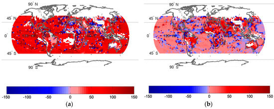 As done in [20], the model-computed GDB over 2001–2009 has been evaluated against available information from stations from the reference global networks of GEBA and BSRN. Here, the number of stations (fulfilling the availability criteria described in Section 2) is increased compared to the study by [20], from 91 to 105 for GEBA, and from 14 to 20 for BSRN. For each station, the tendencies of SSR from the GEBA/BSRN time series of monthly SSR anomalies were computed and compared to the corresponding tendencies of the time series of model SSR anomalies for the 2.5-deg geographical cells that include each GEBA or BSRN station. It should be noted that in the corresponding comparison made in [20] (their Figure 2), the tendencies of SSR and not of the SSR anomalies were computed and compared. Here, the use of SSR anomalies was preferred to the use of SSR fluxes themselves, for which a large R value would be dominated by the strong seasonal cycle of SSR. The model and station SSR tendencies (Figure 3a,b) are in quite good agreement, much like the work by [20]. The same tendencies of SSR (anomalies) are found in 67 (or 64%) out of 105 GEBA stations, against 54 out of 91 (or 60%) in the work by [20]. For BSRN stations, same tendencies are found here for 13 out of 20 (65%) BSRN stations, while the corresponding number in the work by [20] was 13 out of 14 stations. The differences between the present study and those in [20] should be attributed to the different time periods and the use of SSR anomalies instead of fluxes. The good agreement between the RTM and GEBA/BSRN GDB is also confirmed by the fact that the computed correlation coefficients (R) are higher than 0.8 for 43 (41%) GEBA stations and 9 (45%) BSRN stations, indicating a similar good performance of the model against both station networks. Our results (Figure S1) also confirm the ability of the model to match the variability of the GEBA and BSRN station SSR time series. More specifically, 16 out of 20 stations (80%) have differences in model and station 95% CI (confidence interval) values that are smaller than 30%, 12 stations (60%) have differences smaller than 20%, and seven stations (35%) have differences smaller than 10%. Even better statistics are found for the GEBA stations, for which 99 out of 105 (i.e., in 94% of stations) have differences smaller than 30%, 82 stations (78%) have differences smaller than 20%, and 57 stations (54%) have differences smaller than 10% (from which 33 have differences smaller than 5%).
