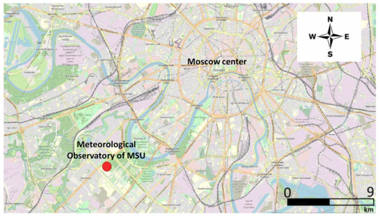 The intensive campaign was performed in the southwest of the Moscow city from 17 April to 25 May 2017. Aerosol sampling was conducted at the rooftop of two–story building of the Meteorological Observatory of Moscow State University (MO MSU) (55.07′ N, 37.52′ E) (Figure 1). MO MSU is located at the territory of the MSU campus, in an area of Vorob’evy Gory hills, which is well-ventilated. There are no industrial plants or commercial areas nearby. At about 800 m to the north and north-west from the MO MSU, there are the residential area and the Lomonosovsky prospect highway, respectively. The closed industrial enterprises are central heating stations at a distance of 3 km from the MSU. Therefore, the MO MSU is considered an urban background station. The recent aerosol and its radiative effects observed at MO MSU during the AEROCITY 2018 experiment was presented in [30].