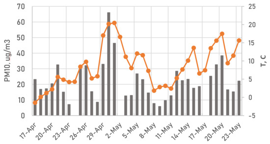 PM10 mass concentrations over the sampling period show a strong variation from the lowest of 8 µg/m3 to the highest value of 64 µg/m3, on average 22 ± 16 µg/m3 (Figure 2). The longest episode of the highest PM10 was observed at MO MSU on 29 and 30 April, on average 55 ± 19 µg/m3. On nearly the same days, from 29 April until 2 May, the ambient temperature approached an abnormally high level for this season: +21 °C. We observed relatively good correlation between high PM10 and the local temperature maximums (Figure 2), with correlation coefficient R2 equal 0.68.