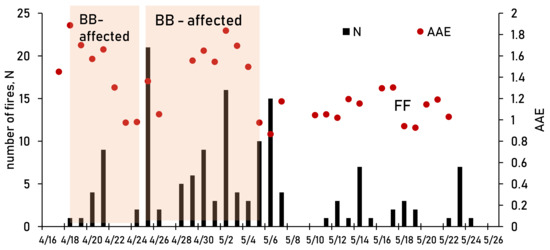 The light spectral absorption can be applied as a source-specific optical marker for impact of BB on urban aerosols. The sampling period of our study can be divided into periods of low and high AAE. The formal criteria for parametrization were chosen to be based on the observations performed in an urban environment, where the separation between BB-affected and FF periods was proposed at an AAE level of around 1.3 [21]. Thus, we addressed the days of the weak spectral dependence with AAE = 1.08 ± 0.02 to the dominant impact of fossil fuel combustion emissions with less impact of biomass burning during the “FF” period (Figure 3). Days of the dominant impact of biomass burning emissions during “BB-affected” period show a high spectral dependence with an averaged value AAE = 1.61 ± 0.02. Similar results for traffic emissions were obtained in the Hanoi megacity with an AAE equal to 1.3 (Popovicheva et al., 2017b), indicating that traffic produces significantly less BrC and more BC than biomass burning. The number of fires passed by air masses relates to BB-influenced days (Figure 3).
