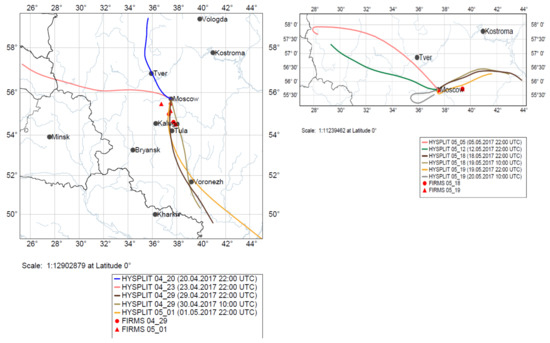 To evaluate the air mass transportation impact, the backward trajectories (BWT) were generated using the HYbrid Single-Particle Lagrangian Integrated Trajectory (HYSPLIT) model of the Air Resources Laboratory (ARL) [31] with a coordinate resolution equal to 1° × 1° of latitude and longitude. The potential origin areas were investigated using two-day back trajectories for air masses arriving each 12 h to the MO MSU at 500 m heights above sea level (A.S.L.). Fire information was obtained from Resource Management System (FIRMS), operated by the Earth Science Data Information System (ESDIS). Daily maps were related to the computed trajectories, providing a clear picture of the geographical location of fires, with a resolution of several kilometers. The number of fires that could affect air masses transported to the MO MSU was calculated as the sum of fires that occurred at a distance of 0.5° on both latitude and longitude from the BWT.