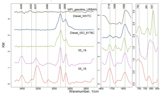 Additionally, to organic functionalities, in the FF period sulfates, SO42− in various salts and sulfuric acids are well observed in the wide range of 661 to 617 cm−1. Sulfates were consistently observed in transport vehicle emissions [10,41,42] due to fuel and lubrication oil contaminations. They show the prominent absorption band on the spectra of off-road diesel engine operated in Non-Road Steady State cycle ISO-8178 (Figure 5).