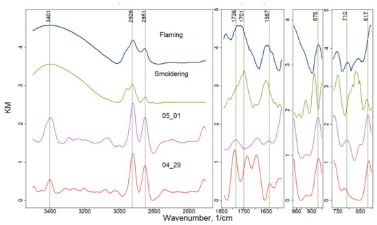 FTIR spectra for 05.01 and 04.29 from the BB-affected period. Spectra of the Moscow regional biomass represented by spruce flaming and mixture smoldering fires.