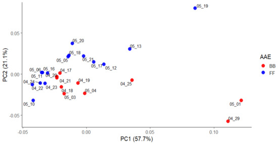 PCA score plots (PC1 × PC2) for FTIR spectra of sampling days marked by red and blue for AAE in the range of 1.61 ± 0.02 and 1.08 ± 0.02, relating to the BB-affected and FF periods, respectively.