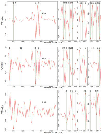 PC1, PC2, and PC3 loadings. Marked extremums are the absorption bands identified on FTIR spectra of daily samples.