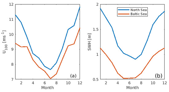 The average monthly wind speed at 100 m above mean sea surface (a) and significant wave height (b) during 2010–2019 over the Baltic Sea and North Sea. Only the sea points from ERA5 are used in the plot.