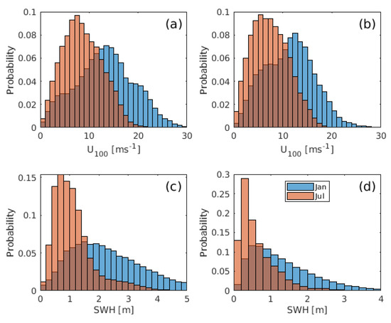 The normalized distribution of wind (a,b) and wave (c,d) for the North Sea (a,c) and the Baltic Sea (b,d) in January and July 2015. Data are from ERA5.