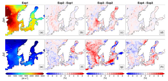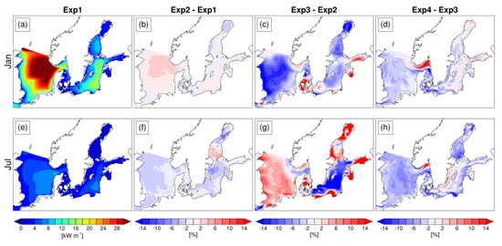 In January, the atmosphere–ocean coupling (Exp3–Exp2) reduces the WPE up to 16% () in the centre and west of the North Sea, while in the Baltic Sea it is less than 10% (Figure 6c). In July, the atmosphere–ocean coupling (Exp3–Exp2) increases the WPE up to (10%) in the North Sea, however, in the centre of the Baltic Sea it reduces the WPE more than (20%) (Figure 6g). At the Polish coast, it increases the WPE about (20%) compared with Exp2 in July.