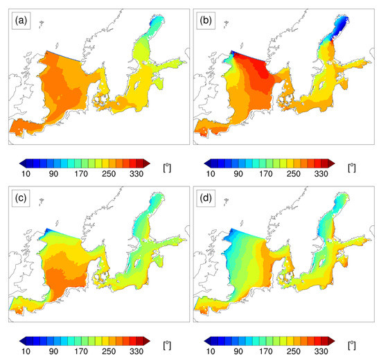 Similar to the WPD, the WPE decreases from north to south in the Baltic Sea. The WPE in the southwest part of the Baltic Sea is > in January, while it is > in July. In the west part of the North Sea, the WPE is > in January, while it is > in July. In both the Baltic Sea and the North Sea, the WPE is generally higher in the east part than in the west part at the same latitude (Figure 6a,e). The direction of the wind and waves are from southwest to northeast (see Figure 7). The fetch limits the wave growth in the west coast and leads to the distribution pattern of the WPE, and it agrees with the climatological simulations presented in [6].