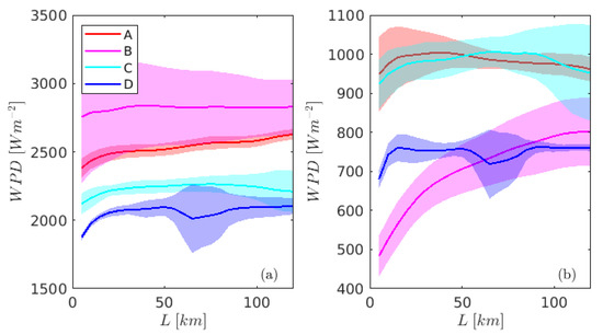 The WPD as function of the distance from the coast for January (a) and July (b) in the four chosen areas from Exp1. A, B, C, and D represent the Danish west coast, British east coast, coastal areas of Lithuania and the Polish coast, respectively (shown in Figure 2). The shaded areas represent the standard deviation.