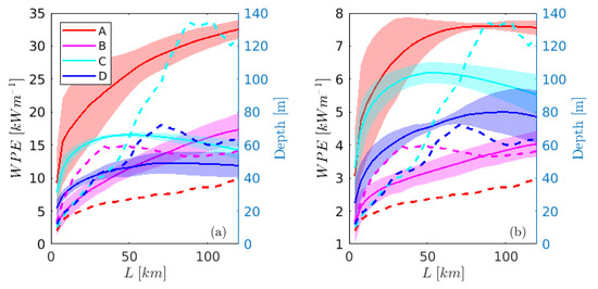 Figure 8 and Figure 9 show the WPD and WPE changes with L in January (a) and July (b), respectively. The mean water depth in the four areas is shown as dashed lines in Figure 9. In general, the WPD increases when km for all the four areas in both January and July. In January, the WPD does not have a significant increasing trend with L for the range km except for area A. In July, the WPD even starts to decrease with the L when km for the areas A, C and D (see Figure 8b). The WPD in area B continues to increase with L in the range km, which is different from the other three areas.
