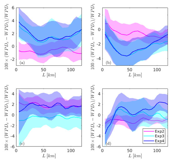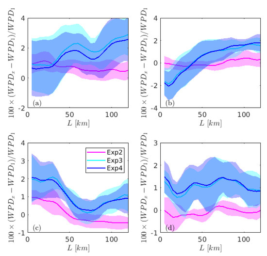 The relative difference of WPD between the sensitivity experiments (i.e., Exp2, Exp3, and Exp4) and Exp1 for the four chosen areas: (a) A, (b) B, (c) C and (d) D in January 2015. The shaded areas represent the standard deviation.