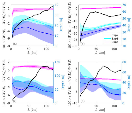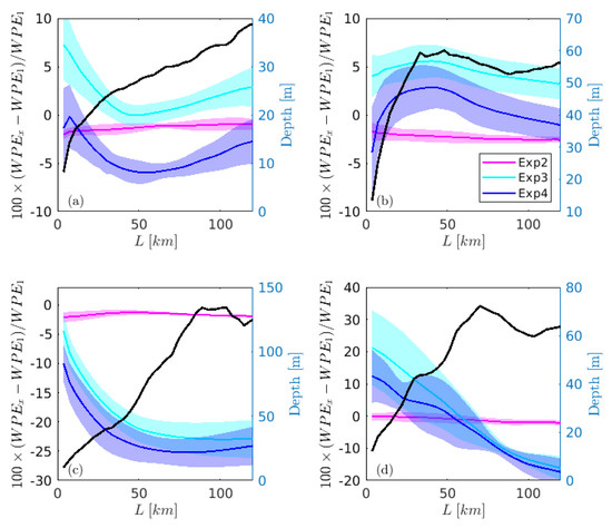 The relative difference of WPE between sensitivity experiments (i.e., Exp2, Exp3, and Exp4) and Exp1 for the four chosen areas: A (a), (b) B, (c) C and (d) D in January 2015. The shaded areas represent the standard deviation. The black solid lines represent the water depth changes with distance from the coastline.