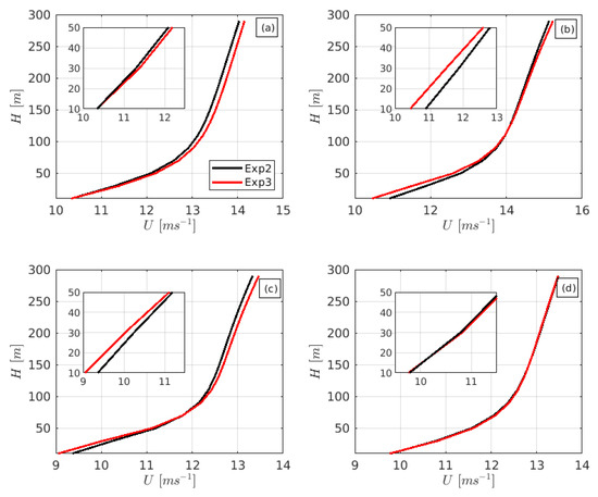 The mean wind profile in January from Exp2 and Exp3 at the four chosen areas: (a) A, (b) B, (c) C and (d) D. The insert plots show in the wind profile below 50 m.