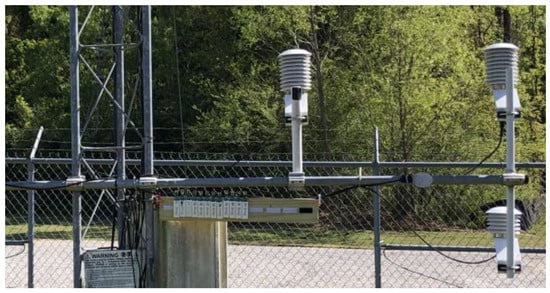 From prior chamber experiments, it was concluded that the iMET-XQ temperature measurements were within the manufacturer specified accuracy of a NIST-traceable standard []. Hence, chamber experiments will not be repeated in the current study. It was also reported that thermistors are prone to self-heating, but this can be mitigated by proper aspiration [,]. No guidelines were given to define ‘proper’, for example, an air flow speed. To our knowledge, in the past, only one experiment was conducted with iMET-XQ sensors in a stationary location on an instrumented tower []. However, this experiment involved only iMET-XQ sensors in a radiation shield and results from varying weather conditions were not addressed.