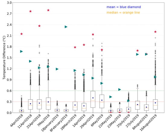 Boxplots of temperature differences (°C) for all iMET-XQ pairs by date for the 16 Tower experiments (including the 3 dusk days). Red stars represent relative solar radiation values averaged over the duration of each experiment. Green triangles represent relative 2 m wind speed values averaged over the duration of each experiment. Table 1 provides the actual values of mean solar radiation and mean 2 m wind speed values. The temperature difference means are represented by blue diamonds, the medians are shown by orange lines. A temperature difference of 0.3 °C is marked by a red dotted line. A temperature difference of 0.6 °C is marked by a green dotted line.
