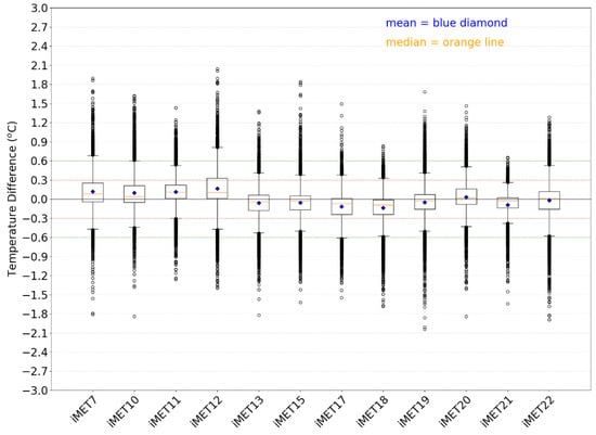Temperature difference (°C) boxplots for each iMET-XQ sensor (x-axis) with all the other iMET-XQ sensors for the day-time tower experiments (i.e., the dusk experiments were excluded). The means are represented by blue diamonds, the medians are shown by orange lines. A temperature difference of ±0.3 °C is marked by a red dotted line. A temperature difference of ±0.6 °C is marked by a green dotted line.