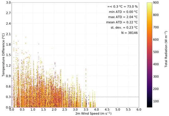 There are several outliers in Figure 4 and Figure S2, the largest of which are close to 2.0 °C. The question is what atmospheric conditions, if any, lead to these larger outliers. In Figure 5, the ATDs for all iMET-XQ pairs and all experiment days are shown as function of 2 m wind speed (along the x-axis) and solar radiation (colors). The wind speed is measured at the Mesonet tower at a height of 2 m, this is close to the iMET-XQ sensors which were mounted 1.5 m above ground level. It is clear that large ATD values occur with lower (2 m s−1 or less) 2 m wind speeds and ATD values generally decrease with increasing wind speeds. However, in weaker winds, smaller ATD values also occur, maybe these occur when the solar radiation is low. But a clear relationship between temperature differences and the intensity of solar radiation, cannot be discerned from Figure 5. Apparently, any value of solar radiation (darker purple though yellow dots) can cause the temperature difference between iMET-XQ pairs to be large in weaker winds, even if the iMET-XQ sensors are located side-by-side. Similarly, darker purple (low radiation), orange, and yellow dots (high radiation) are seen at both small and large temperature differences. The non-aspirated radiation shield that was used on the tower will cause the tower temperature sensor to also warm up in sunnier and calm conditions [], possibly explaining the lack of a clear relationship between TD and solar radiation. The relationships of ATD and TD with solar radiation and wind speed are further explored in the following sections.