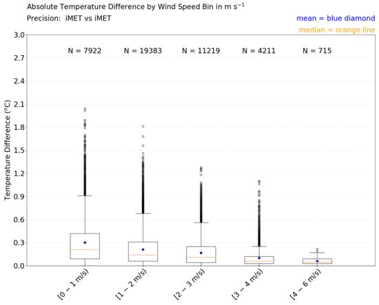It is noted that for the two weakest wind speed bins, the mean and median ATD are positive (Figure 7) and 75.6% and 59.4% of the TDs are positive, respectively. In other words, the iMET-XQ temperature is usually warmer than the tower sensor. For the two strongest wind speed bins, the mean and median are negative and 73.3% and 84.7% of the TD observations are negative, respectively. In other words, the tower sensor is usually warmer. Apparently, the iMET-XQ sensors respond better to natural aspiration at these higher wind speed values than the tower sensor; the latter perhaps experiencing warming by being enclosed in a non-aspirated radiation shield, which might have absorbed heat from the sun []. That being said, when the wind speed increases to over 4 m s−1, both of the sensors are well aspirated and the absolute values of their TDs are all below 0.3 °C. In wind speed bin 3–4 m s−1, 66.13% of TD observations are below 0.3 °C and 94% of the TD observations or below 0.6 °C. This confirms that, for wind speeds above 3 m s−1, the iMET-XQ sensors accurately measure temperature.