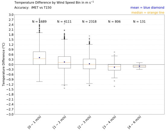 Figure 12a shows the TD = Texposed − T2m between the tower-mounted exposed iMET-XQ sensor (Texposed) and the HMP-45C tower sensor at 2 m AGL (T2m) by wind speed bin. The temperature difference spread (whiskers on the box plots) decreases with an increasing wind speed. The first wind speed bin also has 63.9% positive temperature difference values, which means that, in more cases, the iMET-XQ sensor is warmer than the tower sensor. The last three wind speed bins (wind speed greater than 2 m s−1) contain 57.8%, 74.4%, and 100% negative TD values, respectively (tower sensor warmer in most cases) and they display less spread in temperature difference values.