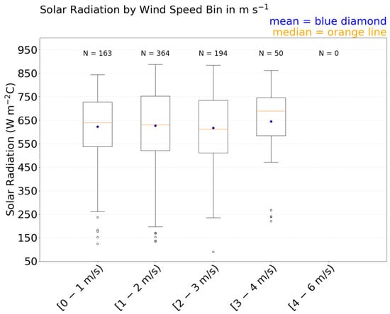 Figure 6 and Figure 7 clearly show that the mean, median, and spread of the ATD and TD values decrease with increasing wind speed. Hence, the precision and accuracy of the iMET-XQ temperature observations improves with increasing wind speed. The solar radiation distributions for each wind speed bin are presented in the form of boxplots in Figure 8 to make sure that this was not caused by the dominance of low radiation values in the higher wind speed bins. Unfortunately, the solar radiation sensor malfunctioned when observations in the last bin (4–6 m s−1) were made. When comparing the 0–1 m s−1 and 1–2 m s−1 wind speed bins, Figure 8 shows that the higher wind speed bin has a slightly smaller mean solar radiation value. However, the higher wind speed bin also has a larger 75th percentile (top of box) and longer upper whisker. This means that there are more large radiation values in this bin. Figure 6 shows that the higher wind speed bin also has smaller ATDs. Apparently, efficient aspiration by the stronger wind speeds in the 1–2 m s−1 wind speed bin, reduces the ATDs, and compensates for potential sensor warming effects from higher solar radiation values.