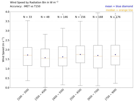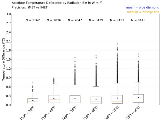 Transitioning to the next wind speed bin (2–3 m s−1), there are more smaller radiation values (Figure 8), which helps with the decrease in ATD values in that bin (Figure 6). When moving to the 3–4 m s−1 wind speed bin, the median solar radiation value is much larger. Again, the larger radiation values are apparently compensated for by stronger wind speeds, explaining the smaller ATD values in this bin. However, there are two caveats: (1) with increasing solar radiation it is possible that all sensors warm and, hence, that solar radiation does not significantly impact the temperature differences among the sensors, and (2) there are significant amounts of missing solar radiation data (due to a Mesonet tower sensor malfunction) in the higher wind speed bins. Therefore, it is possible that the larger mean and median solar radiation values in the 3–4 m s−1 wind speed bin seen in Figure 8 are actually lower. The dependence of iMET-XQ performance on solar radiation is further explored below.