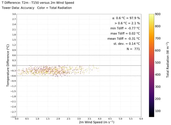 Figure 12b shows that the absolute value of the mean TDs between the iMET-XQ and tower sensors increases with increasing wind speed. In other words, as the wind speed increases, the shielded iMET-XQ sensor records increasingly cooler temperatures than the 2 m tower sensor. In low wind speeds, both of the sensors warm in the non-aspirated radiation shield due to long-wave radiation emitted from the shield []. The iMET-XQ sensor heats less because of the aluminum coating. In medium wind speeds, the lack of heating due to the aluminum coating on the iMET-XQ sensor combined with improved aspiration by stronger winds causes an increased temperature difference between the iMET-XQ and tower sensor. This effect appears to be magnified in strong wind speeds, possibly because there are more high radiation values (>400 W m−2) in the upper 3 wind speed bins than in the lower 2 bins (last column in Table 5) causing the tower sensor to warm up more by long-wave radiation emitted from the shield.