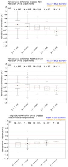 Figure 12c shows the temperature differences (TD = Tshield − Texposed) between a shielded iMET-XQ and an exposed iMET-XQ sensor. It can be seen that the TDs are almost exclusively negative (98.4%, 97.8%, 100%, 100%, and 100% for the five wind speed bins, respectively). Therefore, a shielded iMET-XQ always records cooler temperatures than an exposed unit. This is especially true in weak winds when the exposed iMET-XQ, as expected, heats up too much. As wind speeds increase, the spread in TDs decreases and the mean TD values decrease to within the manufacturer specified sensor accuracy (0.3 °C), even approaching zero. For wind speeds between 1.0 and 2.0 m s−1, 48.1% of the TDs are smaller than 0.3 °C; between 2.0 and 3.0 m s−1 65.4% of TDs are smaller than 0.3 °C, this percentage increases to 80% in the next wind speed bin (3.0–4.0 m s−1), and the percentage is 90% for wind speeds over 4 m s−1. This confirms that the iMET-XQ sensors do not need to be shielded in stronger winds; an exposed unit records almost identical temperatures to a shielded unit so long as the aspiration is adequate.