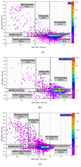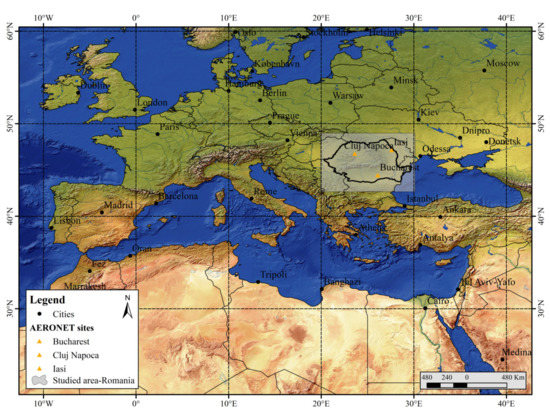- Ajtai, N.; Stefanie, H.; Arghius, V.; Meltzer, M.; Costin, D. Characterization of aerosol optical and microphysical properties over North-Western Romania in correlation with predominant atmospheric circulation patterns, International Multidisciplinary Scientific Geo Conference. Surv. Geol. Min. Ecol. Manag. 2017, 17, 375–382. [Google Scholar]