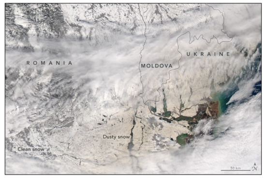- Mărmureanu, L.; Marin, C.A.; Andrei, S.; Antonescu, B.; Ene, D.; Boldeanu, M.; Vasilescu, J.; Vițelaru, C.; Cadar, O.; Levei, E. Orange Snow—A Saharan Dust Intrusion over Romania During Winter Conditions. Rem. Sens. 2019, 11, 2466. [Google Scholar] [CrossRef]